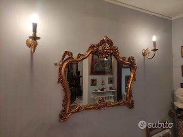 Antiquariato Completo finitura bronzo dorato composto da 2 applique da parete e 1 lampadario a 6 luci La specchiera è stata venduta