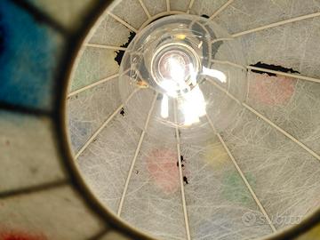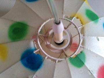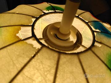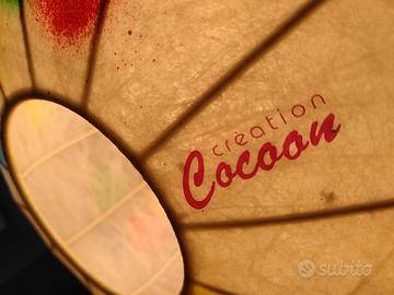 Lampadario di Cocoon Crèation. Sospensione a sfera schiacciata realizzato in cocoon e decorato con spuzzi di vernice multicolor. Diametro 39 cm, altezza 25 cm. La rarita' e il prezzo di questo oggetto e' nota ai collezionisti. L'articolo qui proposto presenta pero' la parte superiore rovinata in piu' punti (da un pappagallo che lo aveva preso di mira). Sapientemente installato, il difetto non si nota, rimane tuttavia un oggetto la cui integrita' e' compromessa, Fate voi il prezzo...