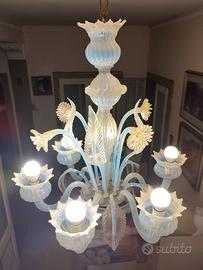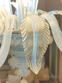 Stupendo Lampadario in Vetro di Murano Originale a 6 Luci, di datazione certa anni 60/70. Praticamente un'Opera Artistica realizzata a Mano dai Maestri Vetrai Artigiani Veneziani, impreziosita da Foglie e Fiori. Di un raffinato colore Celeste/Azzurro con Sfumature in Oro Zecchino 24/k. Purtroppo mancano nella parte bassa 2 Foglie che sono state rotte col passare degli anni. ( una ricordo di averla rotta io da Bambino durante un compleanno, ed ho più di 60 anni). Comunque so per certo che nelle fornaci Muranesi possono rifare i pezzi mancanti o rotti.