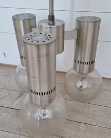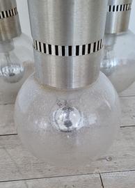 Raro lampadario a 3 punti luce con sfere in vetro soffiato di murano con bolle dal diametro di 15 cm e struttura composta da cilindri di alluminio satinato.Condizioni eccellenti per essere un pezzo degli anni 60'.L'unico difetto come visibile nell'ultima foto è una piccola rottura sul bordo di una sfera che è stata riparata ma non si vede in quanto va a nascondersi una volta infilata la sfera nella struttura, per cui non impatta ne a livello visivo, nè funzionale.