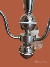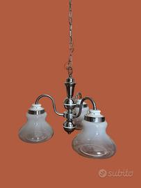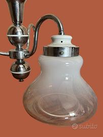 Lampada a sospensione vintage in vetro e metallo a 3 luci (anni'70). Completamente funzionante. L'altezza totale può essere modificata togliendo o aggiungendo maglie alla catena. In buone condizioni vintage. Questo bellissimo lampadario di design è realizzato in vetro bianco sfumato e metallo cromato. Ha un design classico che lo rende adatto ad illuminare qualsiasi tipo di ambiente.