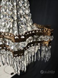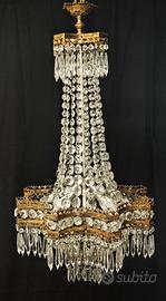 Lampadario a cascata/mongolfiera in stile Impero, databile ai primi del ’900, caratterizzato da una ricca montatura in bronzo dorato e fitta decorazione di pendenti in cristallo molato.