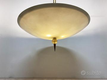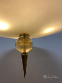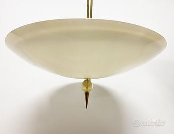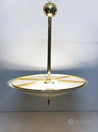 Elegante lampadario da soffitto degli anni '70, interamente in ottone con paralume in opalina e dettagli in vetro. Epoca: Vintage 1970 Provenienza: Italia Dimensioni: Ø 120 x H 160 Cm.