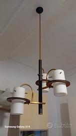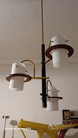 elegante lampadario in stile stilnovo, un pezzo unico per arredare casa con carattere. struttura in metallo con finiture in oro. dettagli in tek elementi in vetro opalino.