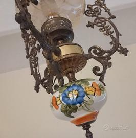 Bellissimo lampadario vintage sorretto da catenelle, vaso in vetro e parte inferiore in porcellana dipinta a tema floreale.