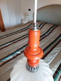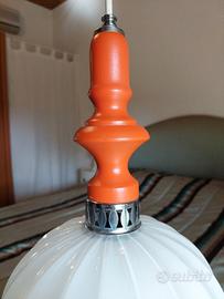 Lampadario space age vintage anni 70 italiano, composto da una parte inferiore in vetro soffiato artigianale a forma di zucca e una parte in legno lavorata al tornio di colore arancione. Filo, cablaggio, portalampada e coppa cromata a muro nuove. Perfettamente funzionante e sicuro. Bellissimo, perfetto in corridoio, bagno, camera o dove vuoi tu. Qualche lieve segno del tempo e in ottime condizioni vintage. H lampadario 42 cm D 25 cm Lunghezza filo regolabile fino a 70 cm