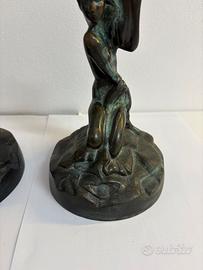 Vendo coppia di eleganti lampade decorative in stile Art Déco, caratterizzate da figure femminili scolpite in bronzo con raffinata patina scura. Le lampade sono abbinate e identiche nella forma, con base solida e corpo slanciato; presentano i vari fori per per installare un portalampada. ideali per arredare con stile un salotto, una camera da letto o uno studio, perfette come lampade da comodino o da appoggio. Disponibile la spedizione o ritiro di persona.