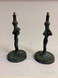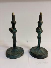 Vendo coppia di eleganti lampade decorative in stile Art Nouveau , caratterizzate da figure femminili scolpite in bronzo con raffinata patina scura. Le lampade sono abbinate e identiche nella forma, con base solida e corpo slanciato; presentano i vari fori per per installare un portalampada. ideali per arredare con stile un salotto, una camera da letto o uno studio, perfette come lampade da comodino o da appoggio. Disponibile la spedizione o ritiro di persona.