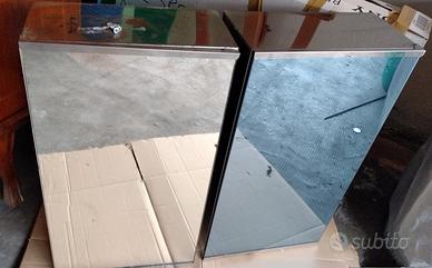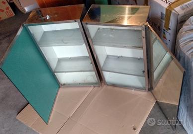 Due armadietti da bagno in metallo, anta in vetro e anta in vetro blu.
