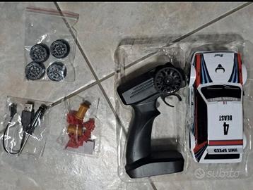 Modello in scala 1/24, radiocomandato, trazione integrale, sterzo proporzionale, velocità 20 km/h, doppio treno di ruote complete normali e slick, batteria ricaricabile con cavo USB, devertentissima e robusta, confezione solo aperta per verificarne il funzionamento