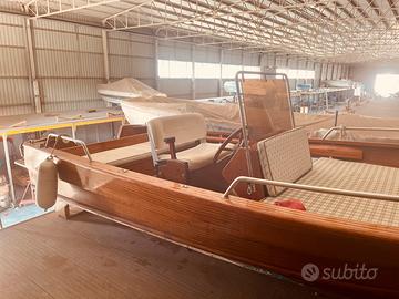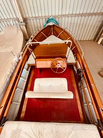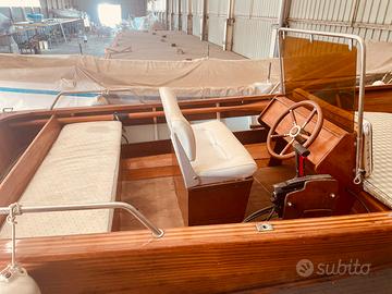 Scafo in mogano e frassino (lunghezza f.t. 5 mt) si porta in totale sicurezza e plana gia’ con motore 25 cv . Complementi e attrezzatura optional compresi nel prezzo: