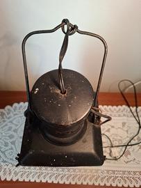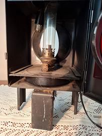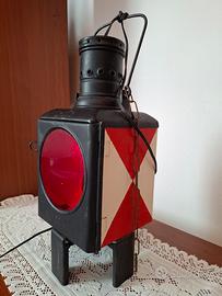 Vendo una lanterna d'epoca utilizzata in ambito Ferroviario Origine Tedesca La lanterna presenta tutte le parti originali d'epoca, più è stata elettrificata per uso domestico Il paralume originale della lanterna è un po danneggiato in punta come visibile nelle foto, dovuto al tempo Realizzato in metallo resistente con un camino superiore per lo sfogo dei fumi della combustione Misura 46 cm di altezza per 18 cm di larghezza Pesa circa 3.2 kg