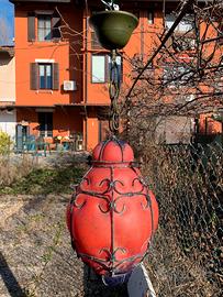 Lampadario a sospensione, in vetro soffiato all’interno di una gabbia di ferro. Lampada Integra, senza fratture a scheggiature, in ottimo stato è pronta per essere installata. Oggetto vintage