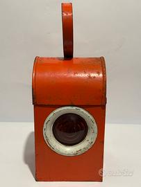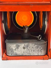 Lanterna vintage industriale in metallo verniciato arancione, con manico superiore e lenti in vetro su tre lati, mentre il lato posteriore è dotato di sportellino apribile che consente l’accesso alla vaschetta interna per il caricamento del combustibile e la gestione dello stoppino originale, presente e funzionante secondo l’uso tradizionale. L’oggetto presenta segni del tempo e usura coerenti con l’età, che ne attestano l’autenticità. Per caratteristiche costruttive, materiali e design richiama le lanterne di origine britannica, diffuse tra fine Ottocento e prima metà del Novecento in ambito ferroviario, portuale e industriale, utilizzate come lanterne di segnalazione e servizio. Oggi rappresenta un pezzo di forte impatto decorativo, ideale per ambienti industrial, loft, studi creativi o come oggetto da collezione. Non è una riproduzione moderna ma un oggetto d’epoca autentico.