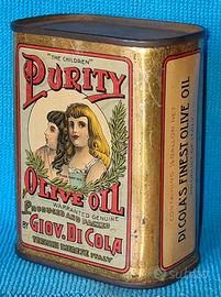 Latta anni '20 Purity Olive Oil - Giovanni Di Cola Termini Imerese Italy 1893. Da 1/8 di gallone, dim.: 12x9,5x6 ottimamente conservata solo normali segni del tempo. Astenersi perditempo massima serietà, grazie.
