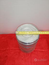 Vendo barattolo pubblicitario in alluminio A. De Coster & C Torino, caramelle - confetti - cioccolato. Non ci sono fori, ma solo delle piccole ammaccature. Dim. altezza 19 cm diametro 14 cm. Condizioni come da foto. Spese a carico del destinatario.