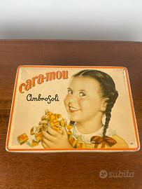 Latta vintage Ambrosoli Cara-Mou, originale degli anni ’50, con la famosa grafica della bambina con le trecce che tiene in mano le caramelle.