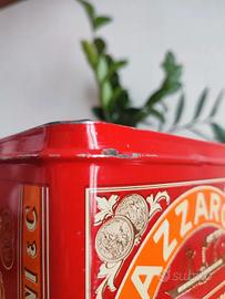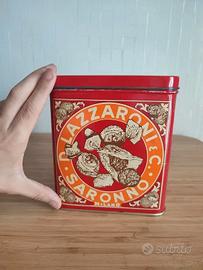 Latta vintage D. Lazzaroni & C. degli anni ’70, dedicata agli storici Amaretti di Saronno. Il contenitore è decorato su ogni lato con motivi grafici ricchi di dettagli: medaglie commemorative, vedute della fabbrica e navi a vapore.