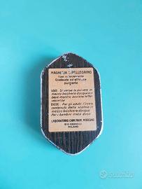 Latta vintage originale di Magnesia S. Pellegrino risalente agli anni '40: un piccolo, grande pezzo di storia della farmacia italiana. Sul fronte spicca l’iconica illustrazione del pellegrino con bastone, simbolo distintivo del marchio, mentre il retro presenta un raffinato motivo effetto legno. Proprio il retro descrive l'uso della polvere effervescente come purgante da sciogliere in acqua. Sulla stessa non è presente il prezzo in Lire, comparso sul prodotto solo a partire dagli anni '60.
