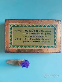 Antica scatolina vintage in latta, databile tra gli anni ’30 e ’50. Conteneva pastiglie disinfettanti per la gola e racconta di un periodo in cui si usavano confezioni metalliche decorate anche per i semplici farmaci da banco.