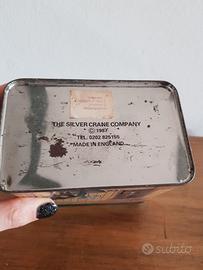 Latta vintage prodotta in Inghilterra nel 1987 dalla Silver Crane Company. Decorata su tutti i lati con illustrazioni narrative in stile western: la scena principale rappresenta la facciata di un negozio di calzature, attorno a cui si sviluppano dettagli di vita quotidiana in un piccolo villaggio del Far West. * Condizioni generali ottime. Segni del tempo visibil in particolare all’interno e sui bordi. Presente una lieve ammaccatura (come da foto). Colori ancora vividi, struttura solida. #BottegaFrixetti // La Silver Crane Company, fondata nel 1971 in Inghilterra, è nota per le sue scatole di latta illustrate, apprezzate per lo stile giocoso e le scene ricche di dettagli narrativi.