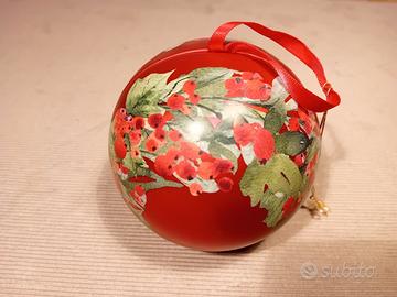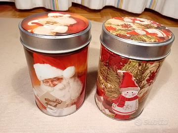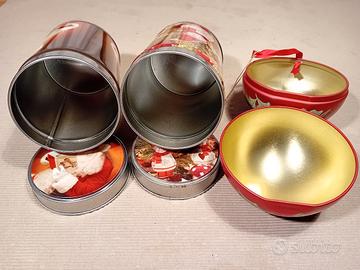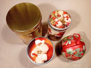 Set di lattine natalizie decorate, perfette per conservare biscotti o piccoli oggetti. Buone condizioni con segni di usura. Visibili e Ritiro a Saronno e paesi vicino. Anche a Stresa (VB). - 2 lattine rotonde con diametro 8 cm e altezza 13 cm. - 1 lattina rotonda con diametro 11 cm e altezza 16 cm. - 1 sfera decorativa in latta.