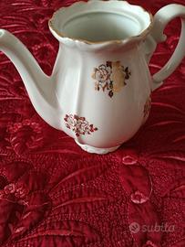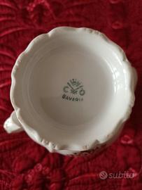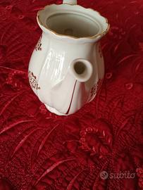 Lattiera ceramica bianca con motivi decorativi floreali in oro della Bavaria. Vintage. Altezza 15 cm. Diametri 11 cm. e 8 cm. Pregiata da collezione. Appartenuta alla nonna. Pesa circa 440 gr. Perfetta senza scalfitture o difetti.