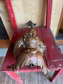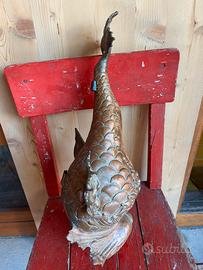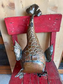 Vendo raro e affascinante aquamanile antico in rame, modellato con grande cura a forma di pesce, tipico esempio di oggetto rituale e funzionale usato nel passato per il lavaggio delle mani.