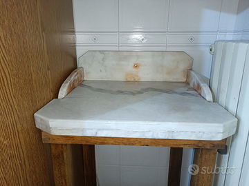 Lavabo antico in marmo con struttura in legno sotto. Misure parte superiore: profondità 46cm, larghezza 50cm, altezza dietro 13cm, spessore 5cm. Misure struttura sotto: larghezza 48cm, altezza 82cm, profondità 37cm. Altezza totale circa un metro. Molto pesante, da ristrutturare. Prezzo ?25. Contattare tramite subito o via sms/whatsapp il 3248986120.