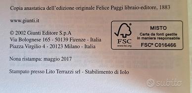 In vendita splendida copia anastatica della rarissima edizione originale de "Le Avventure di Pinocchio - Storia di un burattino" di Carlo Collodi, pubblicata originariamente da Felice Paggi nel 1883.