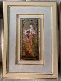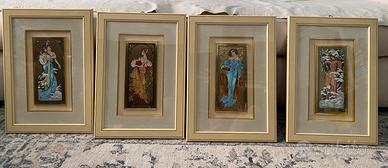Serie completa delle Quattro Stagioni realizzata da Francesca Ciancimino (Cieffe), miniature d’arte eseguite a mano su base serigrafica, con dettagli in oro 24 kt e certificate, montate in cornici Valentino. Tutte in ottime condizioni.