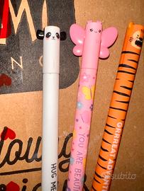 LEGAMI evidenziatori cancellabili + gomma rossetto + tre penne nuove (panda con stella)! Da notare una piccola crepa sul tappo del panda. Tutto nuovo!