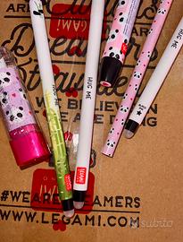 LEGAMI Panda World! Penne prima edizione (con stella e senza), nuova edizione con bambù, matita, gomma a penna, pinzatrice e gomma a rossetto. Tutto nuovo e mai utilizzato. Da notare le due piccole crepe sui tappi delle penne vecchie edizioni.