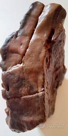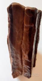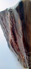 Scheda identificativa: Tipologia: Fossile vegetale (Permineralizzazione). Composizione: Silice microcristallina (Calcedonio/Selce). Colore: Marrone scuro (esterno), variegato dal bruno al miele (interno lucido). La colorazione scura è spesso dovuta a tracce di ossidi di ferro o manganese. Durezza: 7 sulla scala di Mohs (non si riga con l'acciaio). Dimensioni: 6,8 x 5,5 x 2,5 cm. Peso: 135 g. Strutture Visibili: Struttura fibrosa longitudinale (corteccia/cambio), anelli di crescita annuali in sezione trasversale, frattura concoide nelle zone interne. Età stimata: Solitamente i legni pietrificati variano dal Triassico (200+ milioni di anni) al Miocene (5-20 milioni di anni). La conservazione della corteccia è ben definita e rende il pezzo esteticamente bello.