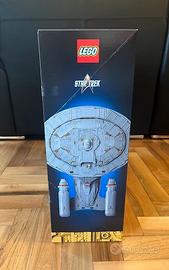 LEGO 10356 Star Trek U.S.S. Enterprise NCC-1701-D is an Icons Star Trek set released in 2025, containing 3,600 pieces and 9 minifigures. The build recreates the Federation starship from Star Trek: The Next Generation and measures about 60 cm long, featuring a detachable saucer, secondary hull with warp nacelles, an opening shuttlebay with two shuttlepods, and an angled display stand. Printed elements include the “USS Enterprise NCC-1701-D” registry, hull paneling, and docking hatches, with transparent blue and red parts used for the warp field grilles and Bussard collectors. The included minifigures are Captain Picard, Commander Riker, Lieutenant Commander Data, Lieutenant Worf, Lieutenant Commander La Forge, Dr. Crusher, Counsellor Troi, Wesley Crusher, and Guinan.