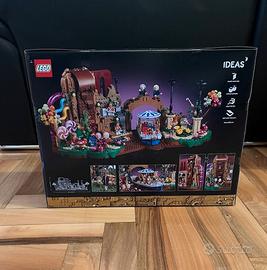 LEGO 21360 Willy Wonka & the Chocolate Factory is an Ideas Licensed set released in 2025, containing 2,025 pieces and 9 minifigures. The build depicts the chocolate factory with a hand-cranked chocolate waterfall, the S.S. Wonkatania boat, edible-themed plants such as a teacup plant and a candy-cane tree, and Willy Wonka’s office with a secret door. Minifigures represent characters from the 1971 film, including Willy Wonka and both male and female Oompa Loompas. Hidden references include a giant Everlasting Gobstopper, a tiny Mike Teavee on a TV screen, and subtle nods to the original fan designers.