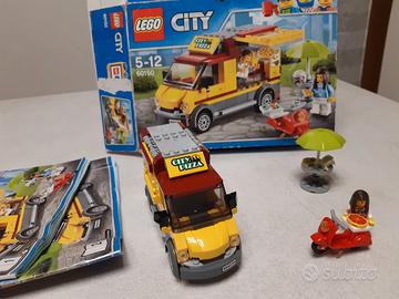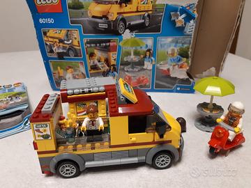 Set LEGO City 60150 "Furgone delle Pizze", contenente furgone delle Pizze , scooter per le consegne e figure. Presente scatola originale e i 2 libretti di istruzioni. Alcuni pezzi/accessori rispetto all'elenco originale sono mancanti, il pezzo sotto al furgone è purtroppo diviso in due parti ed è da montare come da ultima immagine