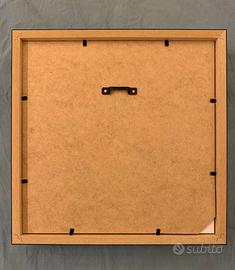 La cornice è in legno laccato con colorazione bianco o nero (disponibile a richiesta), comprensiva di vetro anteriore antipolvere e di un comodo gancetto posteriore per appenderla. Misura 25x25cm esternamente, e 23x23 internamente. Lo spazio utile interno è di oltre 3cm.