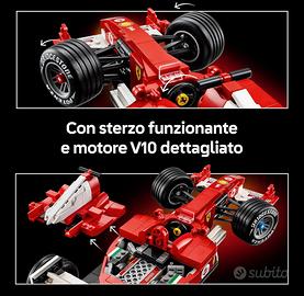Modello da collezione ispirato alla leggendaria monoposto di Formula 1 Ferrari, con motore V10 dettagliato e minifigure del pilota.