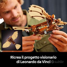 Cosa c’è nella scatola: questo kit di modellismo LEGO da costruire, permette di ricreare tutti i dettagli del visionario ornitottero di Da Vinci, e include un espositore e una minifigure di Leonardo da Vinci con una penna e uno schizzo