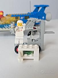 I loghi Classic Space stampati sui mattoncini sono nitidi, con qualche segno d'uso e scolorimento sui pezzi blu. I vetri gialli trasparenti del cockpit non hanno ingiallimenti anomali ma una leggera opacità, normale per un set di oltre 40 anni. Sono presenti segni di gioco e alcuni mattoncini (principalmente blu) mostrano lieve e disomogenea decolorazione, tipica di questi set vintage. Gli omini sono in condizioni molto buone con il logo Classic Space sul petto visibile e segnato dal tempo.