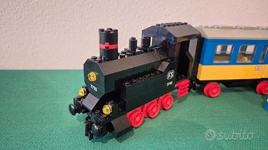 Vendo stupendo set Lego Train 7710 Push-Along Passenger Steam Train, anno 1980. Il treno è in ottime condizioni, con minifigure eccellenti: mancano i pezzi relativi ai binari ed alcuni adesivi laterali dei due vagoni. In regalo motore Lego 4,5V con cavo originali (motore non testato, comunque integro in ottime condizioni, penultima foto) ed alcuni depliant/riviste dell'epoca (ottimi, ultima foto). Spedizione con pacco tracciato InPost con ritiro presso punto di consegna per 6 euro, in alternativa ritiro presso il mio domicilio.