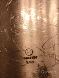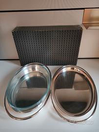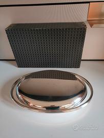 Grande legumiera ovale con coperchio e pirofila interna design Lino Sabattini, prodotta negli anni '70-'80. Materiale:metallo argentato, marcata "Sabattini" sul fondo, dimensioni cm. 43 per 26,altezza cm. 10, dimensioni della pirofila cm. 35 per 24. Condizioni ottime considerando che è un oggetto che ha più di 50 anni: qualche graffio superficiale sul coperchio a specchio. È ancora presente la scatola originale in cui era contenuta.
