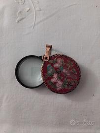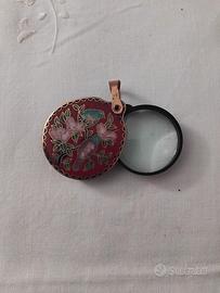lente per lettura vintage con smalti a ciondolo in rame o ottone di origine probabilmente orientale.