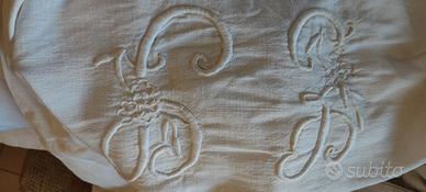 Lenzuola di fine '800, forse prima. Tessute a telaio con cuciture tra i pezzi. Anagrammate con ricamo a mano, presumibilmente lettere S E o S C. Ce ne sono diverse, non saprei dire se da sopra o sotto. Peso, consistenza e ruvidità notevoli. Sono state lavate per saggiarne la condizione, ma non stirate.