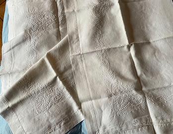 Lenzuolo e 2 federe per letto matrimoniale di tessuto di puro lino, fatto a mano e ricamato da una esperta ricamatrice di Comacchio negli anni 1972 o 1973. Il lenzuolo era stato creato per fare parte del corredo di matrimonio di mia mamma, che però lo ha usato una sola volta e, dopo averlo lavato e stirato, lo ha poi sempre conservato in un armadio, lontano da muffa o insetti. La stoffa è in perfette condizioni, tutti i dettagli di queste lenzuola sono stati curati al massimo e tutti i ricami e le cuciture sono di grande pregio e precisione manuale. Dimensioni del lenzuolo: larghezza 267cm, lunghezza 268cm. La balza presenta ricami floreali di colore bianco a punto pieno, punto ombra e punto rodi, con orli ricamati con punto a giorno. Dimensioni delle due federe: larghezza 54cm, lunghezza 84cm. Ognuna ha 5 bottoni con asole fatte a mano e presenta ricami floreali di colore bianco a punto pieno, punto ombra e punto rodi, con orli ricamati con punto a giorno.