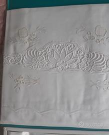Confezione nuova con lenzuolo matrimoniale di sopra e 2 federe in macrame' con custodia originale,anni 70,corredo di nozze.