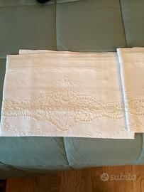 Lenzuolo di lino bianco con federe ricamato e intagliato, appartenente a un corredo anni 50, vintage originale. Ottime condizioni