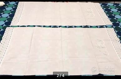 Grande Lenzuolo Matrimoniale in cotone bianco Anni ‘30 con ricamo a mano di punto a giorno sui 4 lati, corredato di 2 coprifedere in cotone finemente ricamate (il colore bianco è uguale alle coprifedere, è solo un effetto di luce del lampadario).