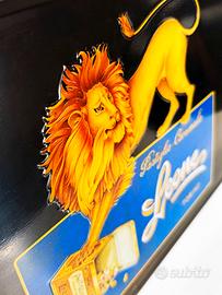 Insegna rettangolare vintage LEONE con scritte a rilievo. Targa in metallo da collezione, riproduzione in ottimo stato con fori di montaggio presenti. Dimensioni: L 34 x H 24 cm